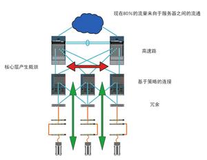 传统的企业网络通常由三个层次组成:服务器连接到接入层,再经汇聚层,最后到基于策略的连接和高速路由核心层。80%的流量流向来自于接入层到核心层,与在网络上只有20%流向是来自于冗余和备份(如图所示)。