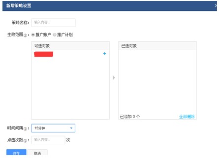 把每天统计查询到的恶意点击IP,记录到一个excel表格中,利用excel中的排序,可以清晰反映出这些IP的规律。如果是一些零散的、毫无规律的单个IP,可以在百度商盾中添加到“手动IP排除”。如果是一些有规律的整个IP段,就添加到“高级IP排除”。对于已监测出恶意点击IP数据的账户,手动IP排除结合高级IP排除,就已经能很好地解决问题。往深层次仔细想想,这样子是不是就无懈可击了呢?在上面的百度统计IP明细图中,IP 59.172.141.56是在点击了4次之后才被发现是恶意点击的,如果是出价高的关键词,有可能就白白糟蹋了几十块的推广费用。如果是在医疗行业呢?如果说是点击了8次、10次才发现呢?损失可想而知了!未雨绸缪才是王道。百度商顿中有个策略展现屏蔽,可以设定在一定的时间间隔中点击一定的次数,就将其屏蔽,防范于未然。可以选择的时间间隔有15分钟、1小时和6小时3个可选项。点击次数可以自己填(3~999),不过一定要谨慎了,搞不好会直接屏蔽掉对有效客户的展现机会,这样就得不偿失了。在设置前,要摸清行业规律和用户搜索、点击、咨询、成交等行为,结合网站统计数据来分析。