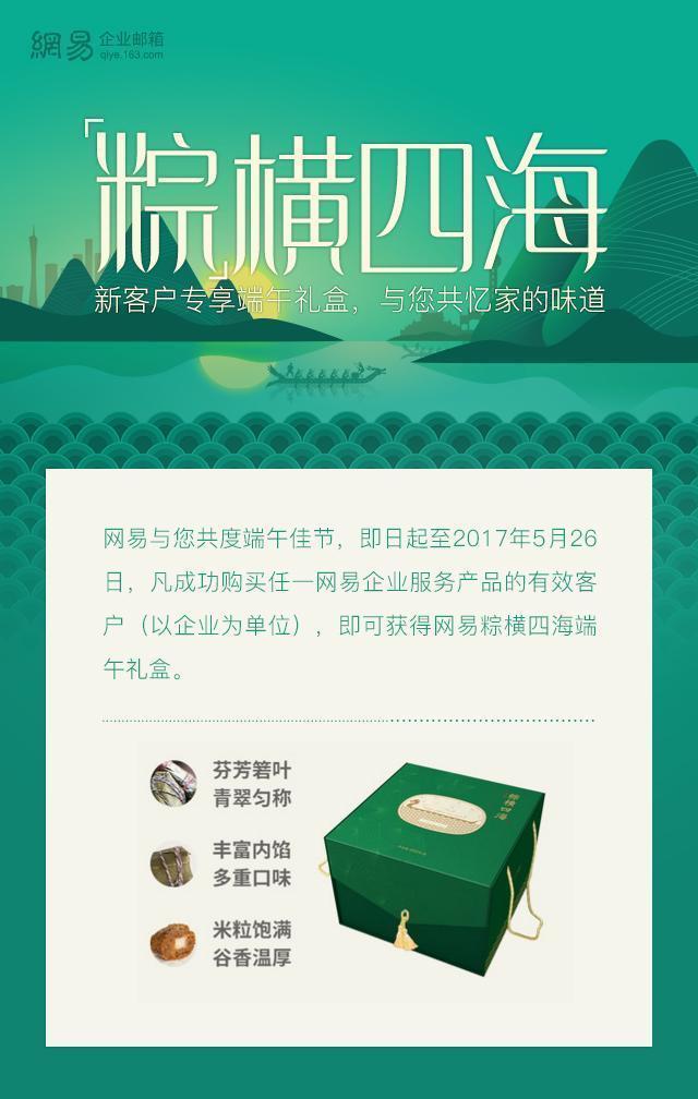 端午佳节将近,网易与您共度佳节!即日起至2017年5月26日,凡成功购买任一网易企业服务产品的有效客户(以企业为单位),即可获得网易粽横四海端午礼盒。