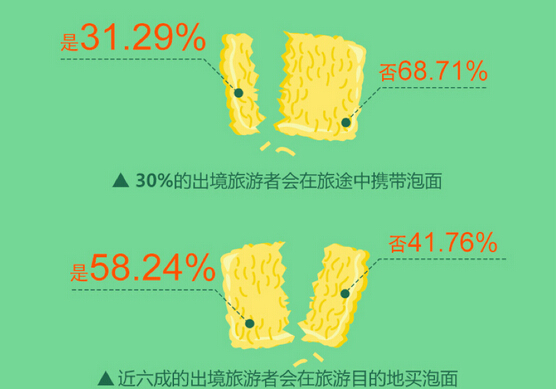 挖财与阿里旅行今日联合发布了《出境旅游与泡面的逻辑考证报告》,这是一组关于旅途中方便面消费的分析数据。数据显示,一半以上的旅行者会在旅途中会吃上几次方便面,尤其体现在境外游,51%的人群因为吃不惯当地的伙食而携带方便面出行。