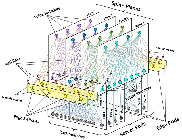 Facebook 的这种数据中心网络结构叫做“Data Center Fabric(数据中心网络)”。它放弃了传统的分层结构以及昂贵的网络设备,而是在整个网络全面部署廉价的架顶交换机,利用一种全新的路由方式极大地改进数据中心的通信效率。在这个数据网络中,其基本单位是一个个的 Pod,每个 Pod 包括 48 台 10G 带宽的架顶交换机以及 4 台光纤交换机,每台架顶交换机分别以一条 40G 的上行链路与光纤交换机互联,向下则接入底层的服务器。